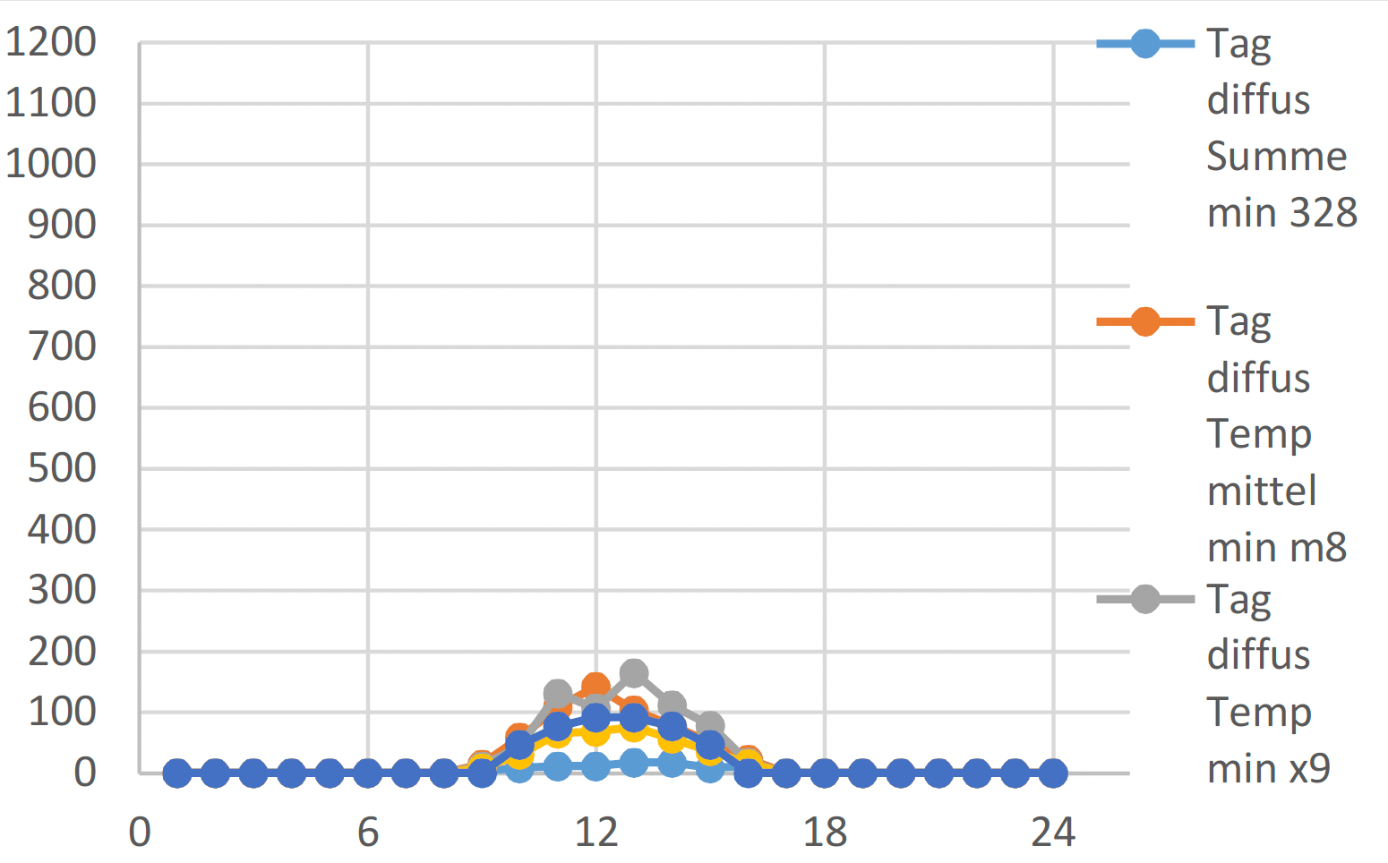 Die Dimensionierung von Heizung und Kühlung erfolgt anhand eines Tagesganges. Die Auswertung wird nicht beschränkt auf einen einzigen Zeitpunkt. Für den Jahresverlauf wird die Auswertung reduziert auf die 24 Stunden eines Tages:
