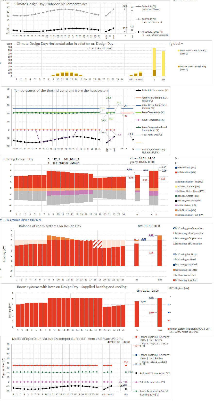 Der Building Design Days + Energy bildet für den Wintertag und den Sommertag eine Zusammenstellung der Wärmequellen und Wärmesenken, also z.B. für den Winterfall die Verluste durch Transmission durch die Gebäudehülle und durch Lüftung sowie Gewinne aus Solar und internen Wärmequellen mit Bilanzierung der erforderlichen Heizung und z.B. für den Sommerfall die Wärmegewinne aus Solar und internen Wärmelasten mit Bilanzierung der erforderlichen Kühlung.